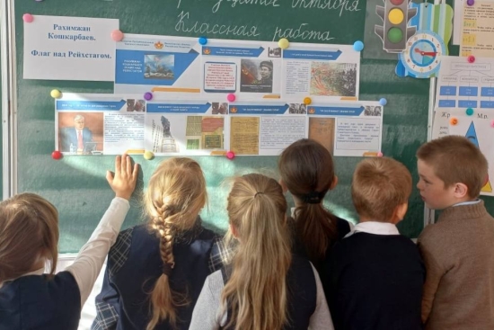 14 қазан күні мектепте «Рахымжан Қошқарбаев Рейхстаг үстіндегі ту» тақырыбында бірыңғай сынып сағаты өтті. Сынып сағатында оқушылар Екінші дүниежүзілік соғыс жылдарындағы ерлік пен қаһармандық символдарының біріне айналған Рақымжан Қошқарбаевтың ерлігі т
