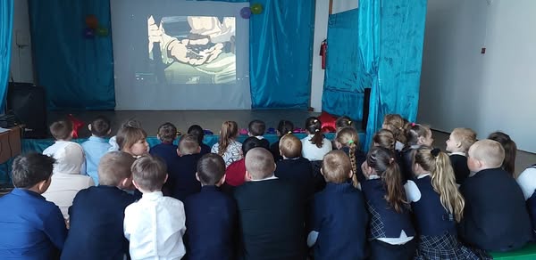 В рамках мероприятий к 80-ЛЕТИЮ ВЕЛИКОЙ ПОБЕДЫ с учащимися начальных классов организован просмотр трогательного мультфильма " Солдатская сказка". Ребята с интересом слушали, делились своими мыслями и сопереживали героям мультфильмов.